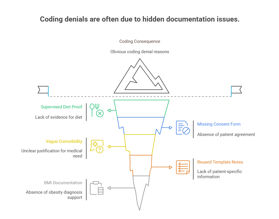 If documentation lacks conservative weight loss treatment (dietary counseling, exercise plans, behavior modification), most insurers will deny the claim outright. Even when the surgery is medically indicated, lack of prior intervention evidence violates payer policy. Coders should ensure at least 6 months of documented visits with relevant ICD-10 Z codes (Z71.3, Z72.4) are present. These visits should demonstrate patient engagement, adherence, or failure. Retroactive documentation is rarely accepted during audits. Instead, coders should flag these issues before claim submission and work with clinical teams to either document the history accurately or postpone billing until requirements are met.