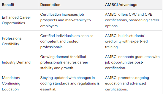 AMBCI offers two certifications: the Certified Professional Coder (CPC) and the Certified Professional Biller (CPB).