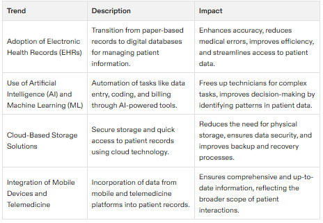 Another trend is the use of artificial intelligence (AI) and machine learning (ML) in medical records management. AI-powered tools can help automate tasks such as data entry, coding, and billing, freeing up medical records technicians to focus on more complex tasks. Additionally, AI can help identify patterns and anomalies in patient data, enabling healthcare providers to make more informed decisions.