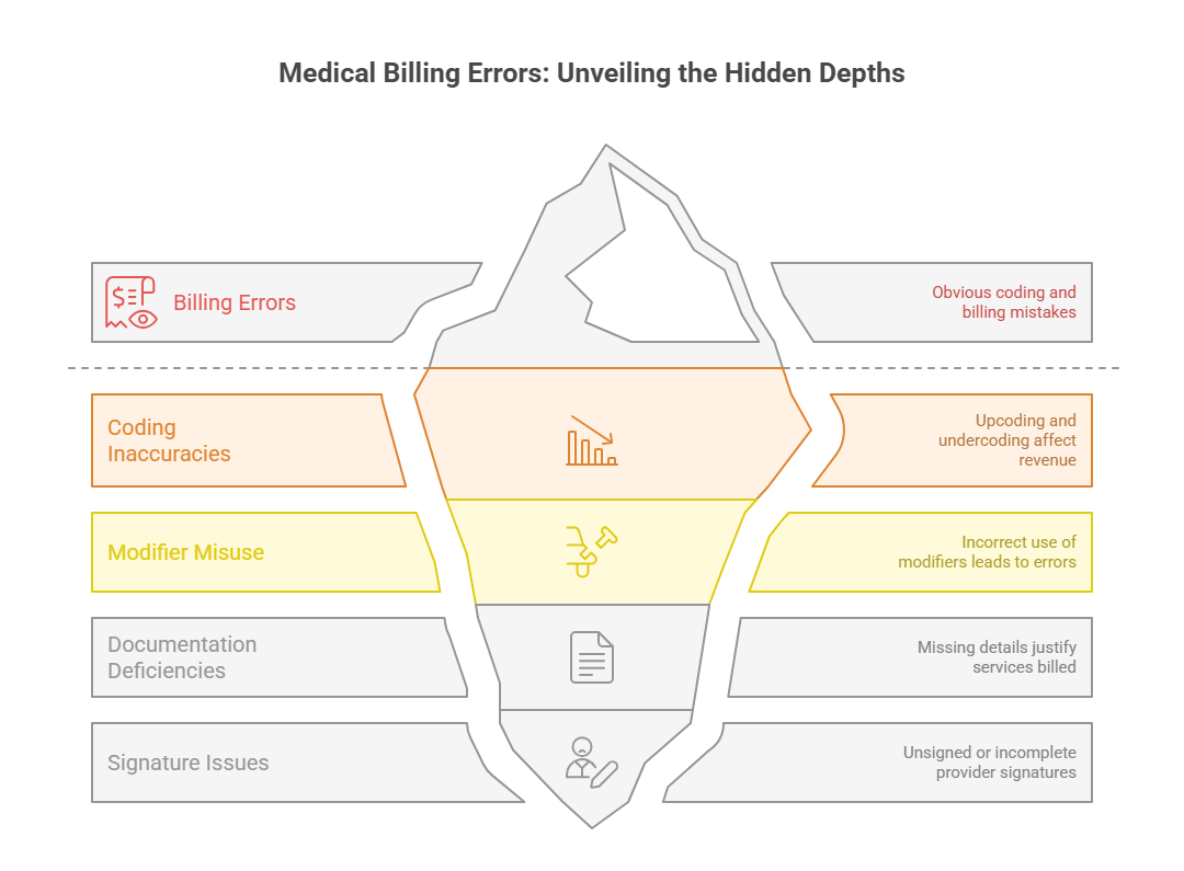 Upcoding is one of the most serious issues uncovered during audits. It refers to assigning a higher-level CPT or E/M code than what the documentation supports. This can lead to overpayments and False Claims Act violations, especially in federally funded programs.